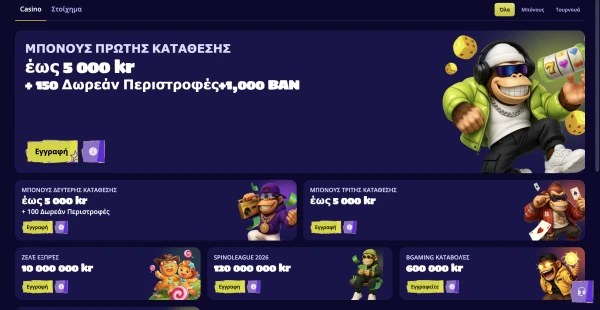 Οι νέοι παίκτες στην Ελλάδα μπορούν να διεκδικήσουν τρία μπόνους κατάθεσης. Η πρώτη κατάθεση δίνει 100% έως EUR 1000 συν 100 free spins. Η δεύτερη δίνει 50% έως EUR 1000 συν άλλα 100 free spins, και η τρίτη δίνει 100% έως EUR 1000 συν 150 free spins. Κάθε βήμα έχει ελάχιστη κατάθεση EUR 15 και κανόνα τζιραρίσματος 30x σε κατάθεση συν μπόνους.